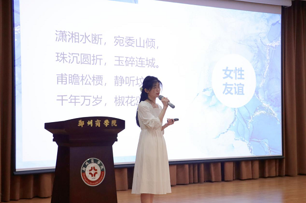 “惊风飘白日,光景西驰流”,时间在潺潺的讲声里流过。第三位读书巡讲人赵宁丹同学结合社会真实情况、新闻报道和现实生活案例为我们分享了她关于书籍《可是我偏偏不喜欢》的阅读感悟,从“为什么要强调女性要爱自己”、“我们所习得的厌女思想”和“女性之间的帮助”三个方面展开了真情地讲述,不同角度的讲述和真实案例成功将观众迅速带入情境。她轻巧地变换站位,轻柔且有力地表达着自己的思想——我们女性一定要爱自己。