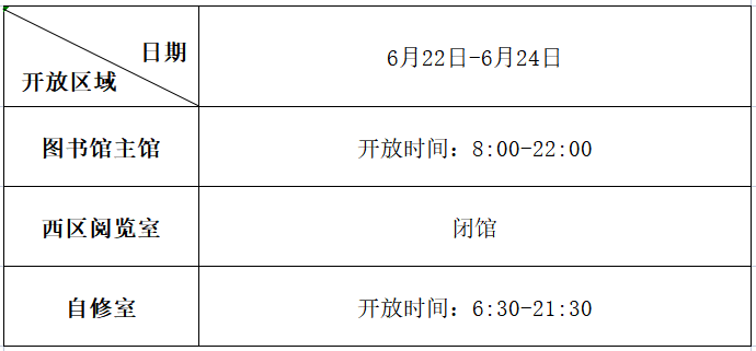 根据学校通知,6月22日-6月24日为端午节假期。为方便假期读者借阅,图书馆端午节假期开放时间如下: