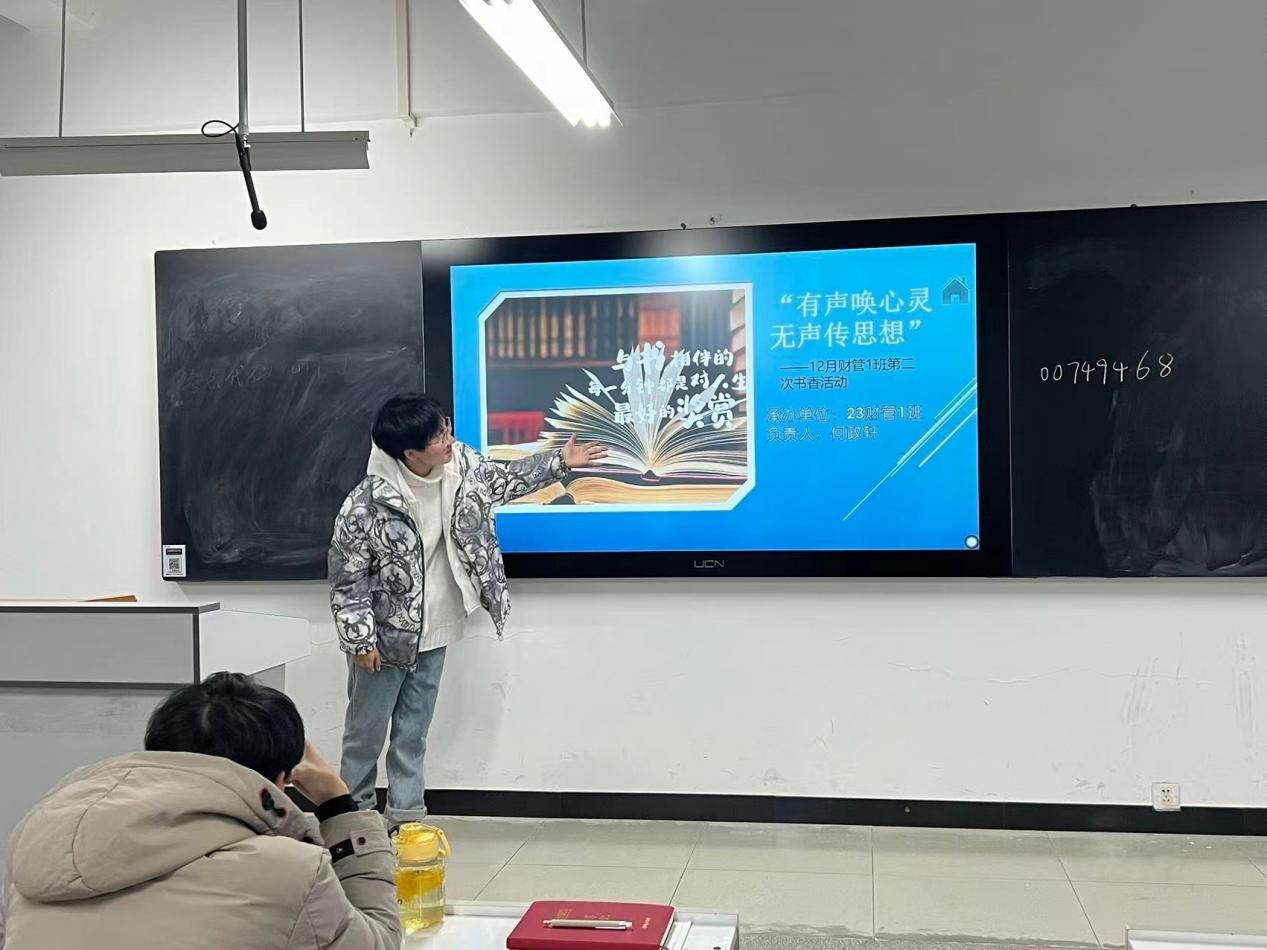 为了推进我院书香校园阅读经典工程的贯彻落实,并提高学生阅读兴趣,创建良好的阅读环境,营造浓郁的读书氛围,也为了提高学生视听说能力,培养学生的辩证思想。以及提高同学们的反应能力,表达能力和思辨能力。同时丰富同学们的课余活动,开阔同学们的视野,提高同学们的阅读兴趣,推动书香校园的建设,12月17日18:00-19:00,23财管1班开展了“有声唤心灵 无声传思想”书香活动。