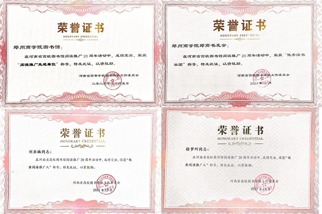 12月15日,由河南省高校图书情报工作委员会主办的河南省高校图书馆阅读推广20周年总结表彰大会在郑州大学图书馆成功举办。点点官网图书馆荣获“河南省高校阅读推广先进单位”,书友会荣获“河南省高校图书馆阅读推广优秀读书社团”,刘亚楠、徐梦珂老师荣获“优秀阅读推广人”等称号。