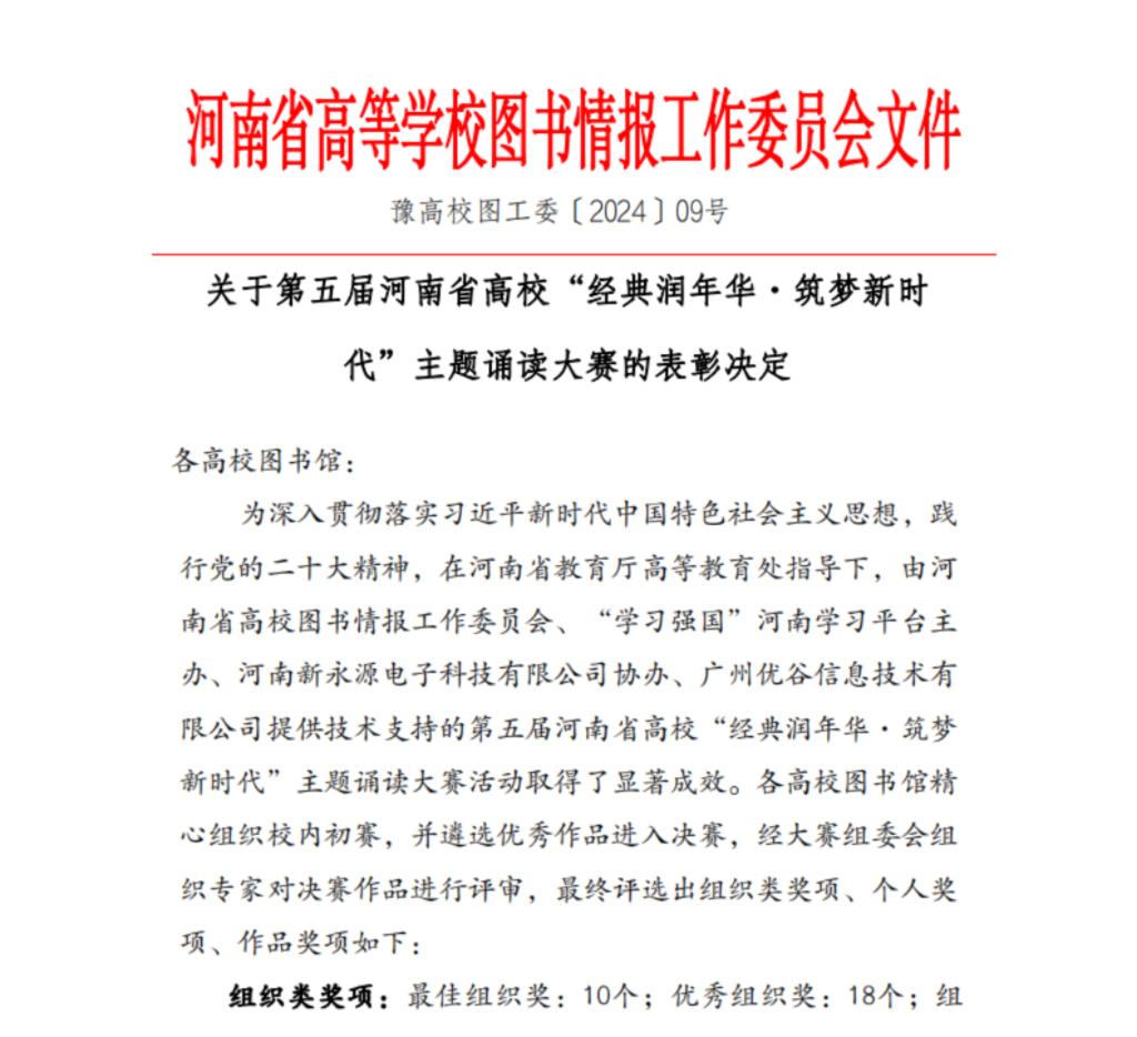 近日,第五届河南省高校“经典润年华·筑梦新时代”主题诵读大赛公布表彰决定。本次大赛在河南省教育厅高等教育处指导下,由河南省高校图书情报工作委员会、“学习强国”河南学习平台主办,图书馆精心组织校内初赛并遴选优秀作品上报大赛组委会。经组委会专家评审,点点官网因组织得力荣获“最佳组织奖”;点点官网学生荣获三等奖3名,网络人气奖3名,唐帅虎、曹萌、张鹏三位老师的朗诵作品获得教师组奖项。