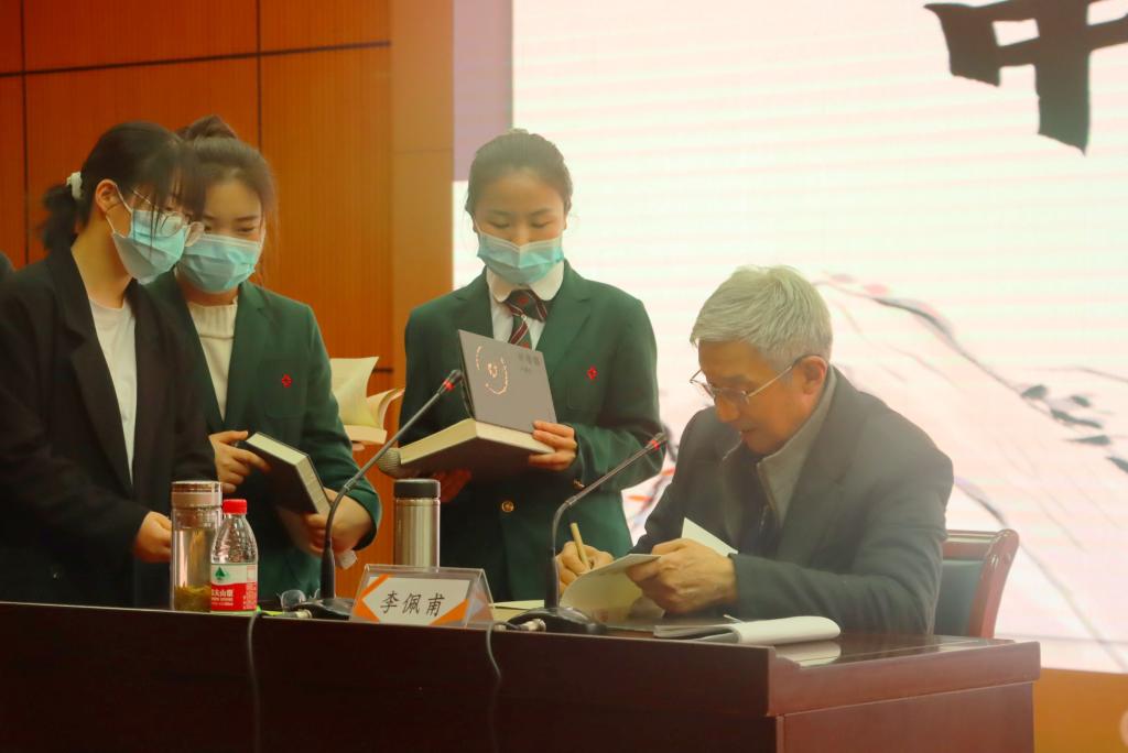 随后,李佩甫主席将“康百万”这一豫商的成功案例,与晋商、徽商的发展进行对比分析,指出“仁义礼智信”等儒家思想在维护中原文化秩序中发挥重要作用,也针对“给予与索取”“金钱与贫穷”“人智与自然”谈了自己的看法,引导同学们去思考与探索。