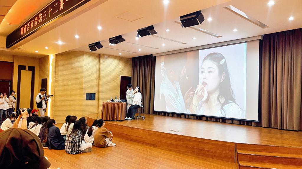 10月10日下午,郑商百家谈第32讲:职场形象美学——妆容礼仪,在图书馆五楼学术报告厅如期举行。此次讲座转学术交流为技术体验,邀请郑州胭脂绒文化传播有限公司高级化妆师冯帆莅校交流,指导师生探索职场妆容之道。全校300余名师生参与交流。
