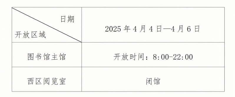 根据学校通知,2025年4月4日—4月6日为清明节假期。为方便假期读者借阅,图书馆清明节假期开放时间如下: