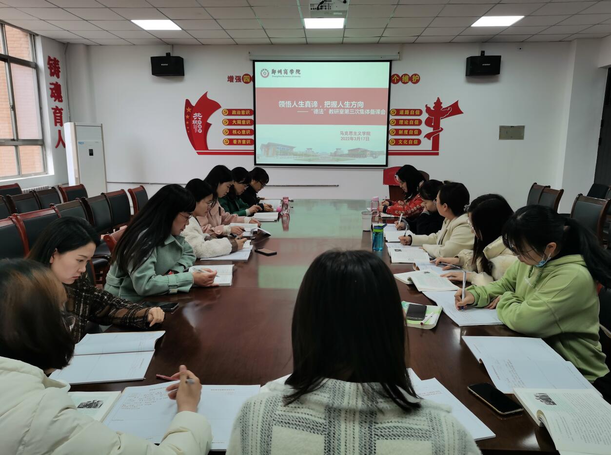 为进一步提高教学质量,加强教师之间的学习和交流,德法教研室于3月17日上午在我院会议室召开“领悟人生真谛,把握人生方向”集体备课会议。会议由德法教研室杨丽丽主任主持,教研室全体教师参加。
