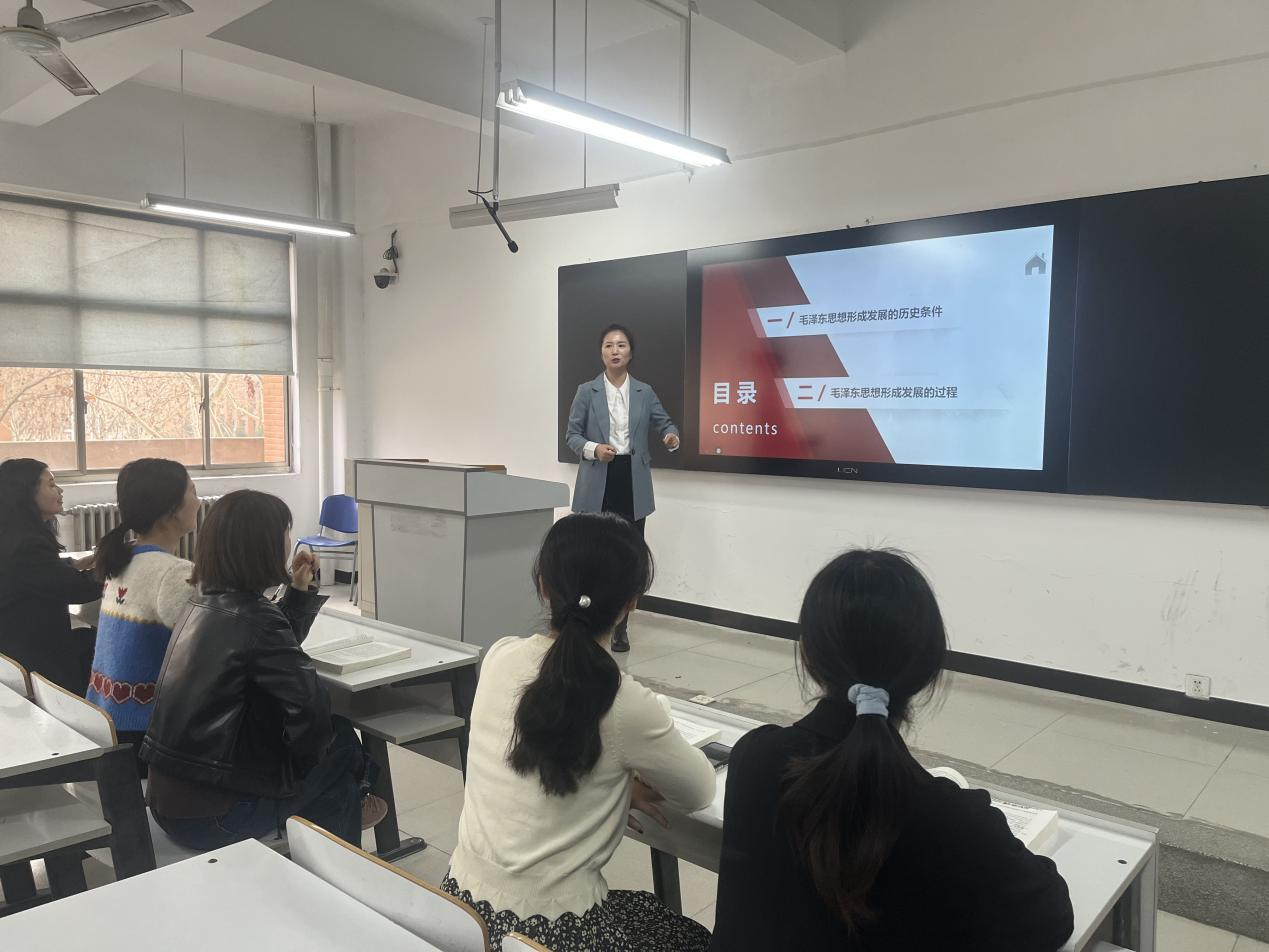 概论教研室的每位新教师进行了微课展示。刘亚欧老师讲解了《新民主主义革命理论》,李洁、杨璐璐两位老师讲解了《毛泽东思想形成发展的过程》,王晓楠老师讲解了《毛泽东思想的主要内容》,杨鑫老师讲解了《毛泽东思想活的灵魂》,蒋晓慧、张雁航两位老师讲解了《毛泽东思想的历史地位》。每位老师讲解之后,小组内的成员会对其优点和缺点进行总结,组员之间各抒己见,帮助各位老师总结经验,认识不足。