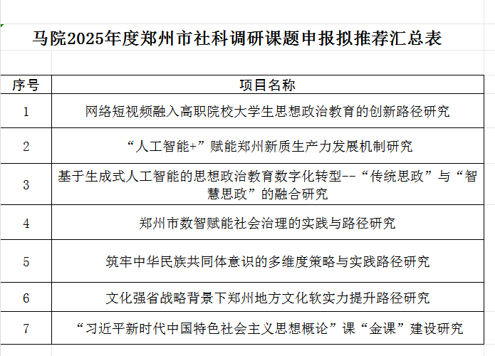 根据点点官网《关于组织申报郑州市社科联2025年度调研课题的通知》要求,我院限报7项。经前期精心组织,广泛动员,马克思主义学院共收到11项申报书。经我院学术委员会评审后,拟推荐以下7项申报书作为我院2025年度郑州市社科联调研课题最终提交材料,名单如下: