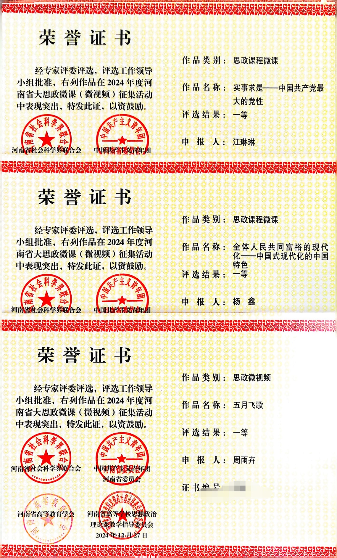 近日,接到河南省社科联、共青团河南省委、河南省高等教育学会、河南省高校思想政治理论课教学指导委员会《关于公布2024年度河南省大思政微课(微视频)征集活动评选结果的通知》(豫社科联字〔2024〕19号),我院三位思政课教师在此次评选中脱颖而出。其中,思政课程微课类作品一等奖2人;课程思政微课类作品一等奖1人。