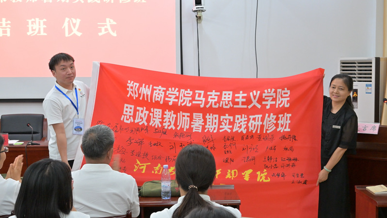 学员代表向大别山干部学院回赠集体签名的培训班班旗