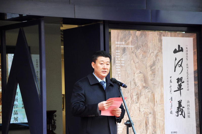 河南省委外事工作委员会办公室秘书处处长姜卫华致辞,他说是缘份把我们凝聚在嵩山北麓、黄河南畔的历史文化名城,共赏油画视角中的山河巩义之美,河洛文化之美。