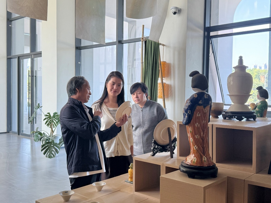在游光明董事长的引导下,教师团队系统参观黄冶窑遗址保护展厅与唐三彩主题陈列馆。游总围绕巩县窑历史脉络、唐三彩考古发现及文化价值展开详细讲解,重点解析馆藏陶瓷、三彩陶、唐青花瓷的釉色工艺与创新突破,让教师们直观感受河洛陶瓷艺术的深厚底蕴——这些鲜活的文化遗产与技艺细节,为《河洛文化赏析》《美术鉴赏》等美育课程提供了“从文物到课堂”的生动教学素材,为课程内容迭代与实践教学拓展奠定基础。