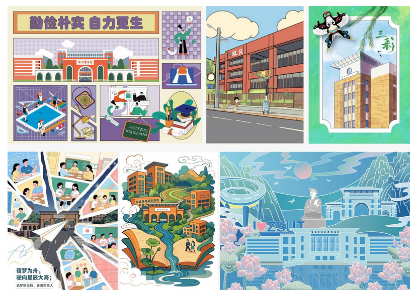 例如,学生设计的《三彩校园四季图》系列插画,既采用符合商业传播的明快色彩与简洁构图,又巧妙将唐三彩传统釉色(黄、绿、白)融入校园春樱、夏荫、秋实、冬雪场景,让传统美学与校园生活自然交融;《校训精神场景化》系列则以插画形式还原 “自力更生” 主题的学生实践活动,用生动画面传递精神内涵。这些作品不仅通过专业评估,更获校区认可 —— 部分插画将用于文化墙更新、校园文创开发,让美育成果从课堂走向师生日常生活,成为可触摸、可感知的校园美学符号。