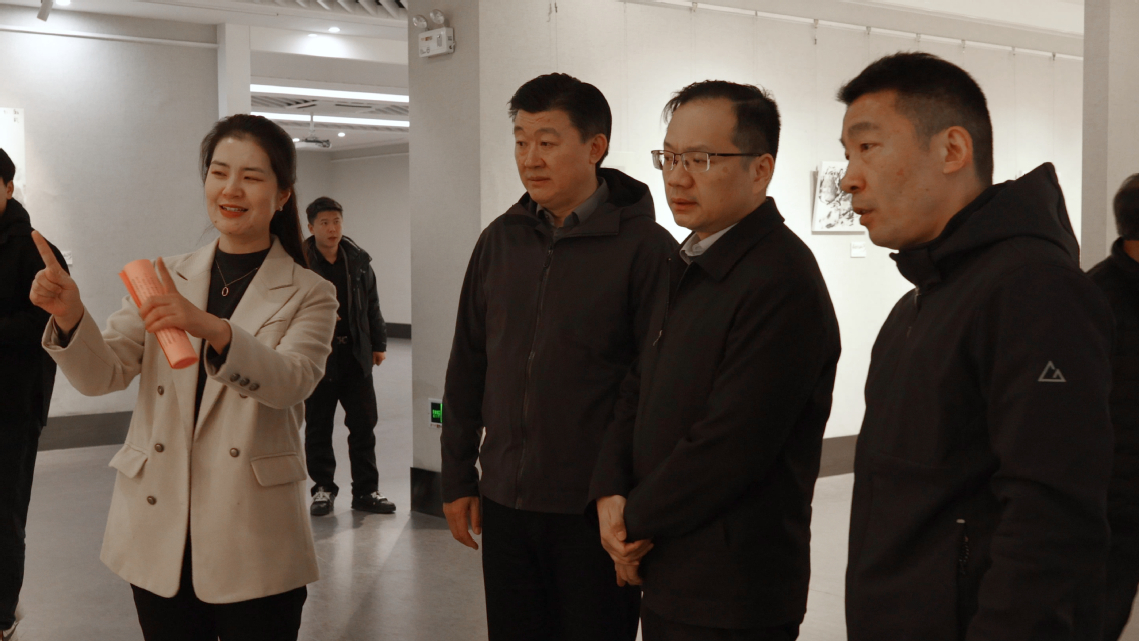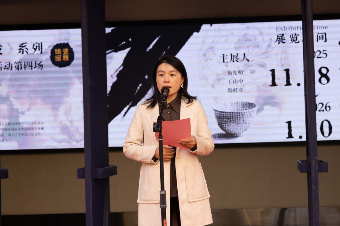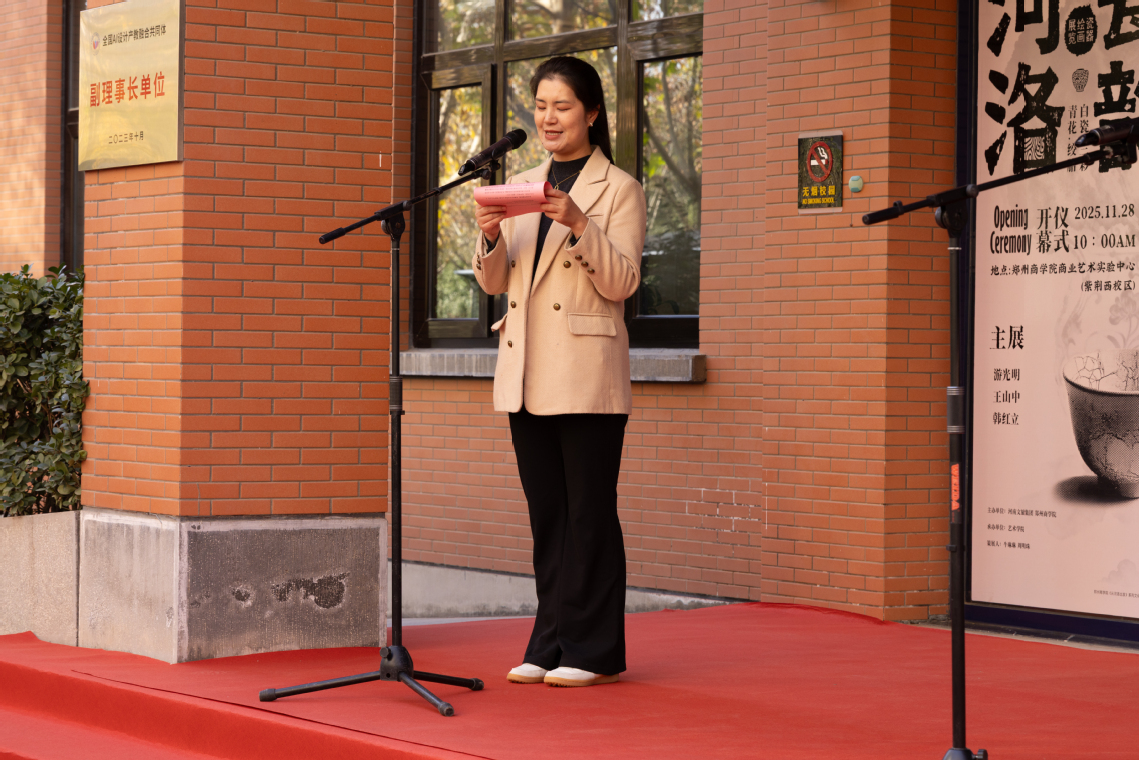 紧接着,梁爽总会计师代表省文旅投资集团祝贺展览开幕,他指出集团正以"行走河南,读懂中国"品牌为核心推动文旅融合,而高校是文化创新的重要力量。他表示愿与学校深化合作,在非遗活化、文创研发等领域携手,推动作品市场化。