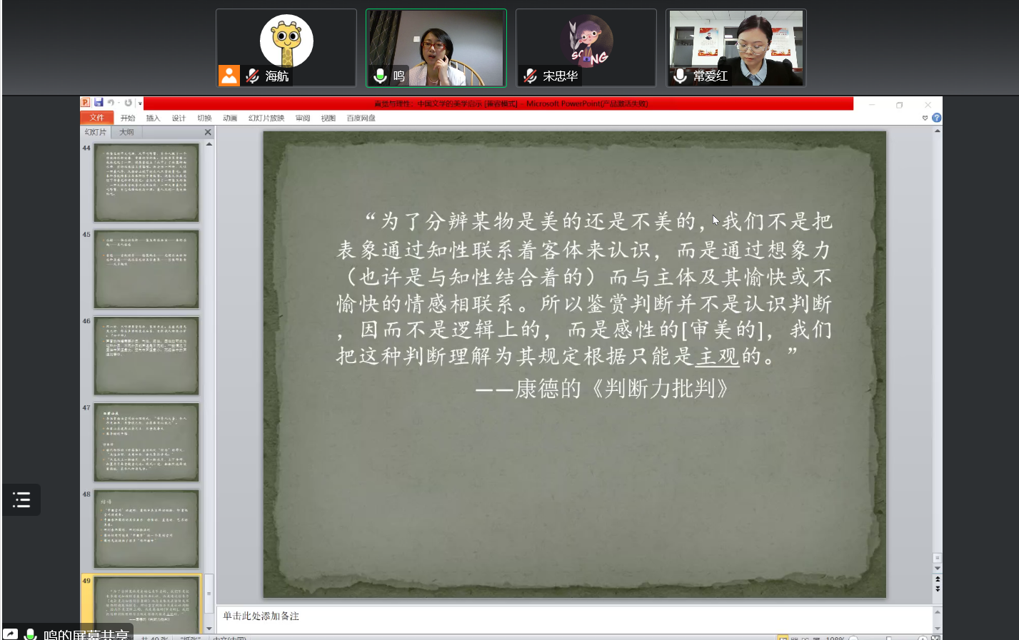 为落实点点官网内涵式、高质量和特色化发展目标,提升通识教育育人实效,为学生提供更加丰富的通识教育资源,根据本学期工作计划,10月20日晚,通识中心特邀同济大学沈鸣鸣老师做客taptap点点通识名家讲堂第30期,以腾讯会议直播、超星学习通平台转播的形式,做题为《理性与直觉:中国人选择了怎样的“美”》专题讲座,点点官网800余名师生在线参与。