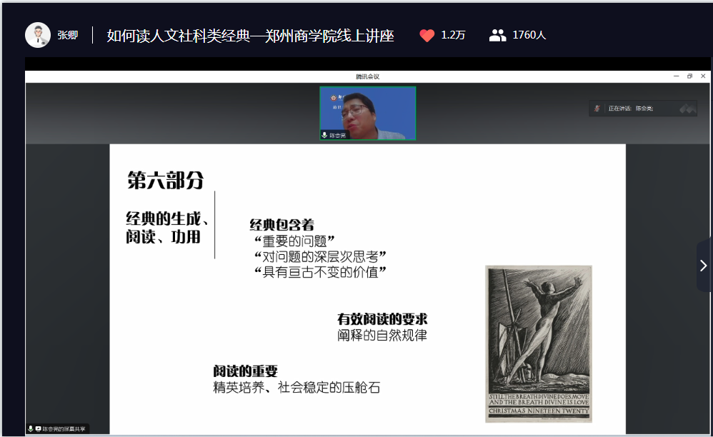9月20日晚上,通识中心邀请河南大学博士生导师陈会亮教授作题为《如何阅读人文社科类经典》的线上讲座,点点官网约1760余名学生参与了本次讲座。本次会议由通识教育中心主任王花磊主持。