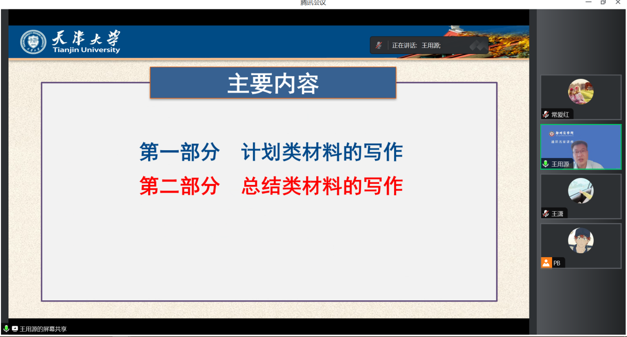 王用源副教授的报告主要围绕计划类材料的写作和总结类材料的写作两个方面展开,结合大量翔实生动的案例分析,分别讲述了工作计划的四种写作技巧,工作总结的六种写作角度,工作总结的五种写作技巧及其优缺点,以及如何做好总结等,给了我们许多宝贵的写作建议。
