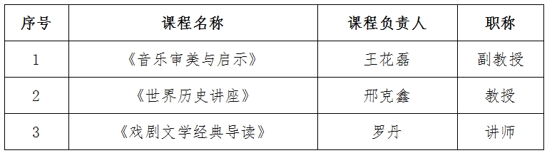 依据《taptap点点通识核心课程建设管理办法》,通识教育中心2022年度立项的校级通识核心课程2年建设期已满。经通识教育中心向教务处提出结项申请同意,聘请学校教学指导委员会专家评审通过,现对2022年度《音乐审美与启示》等3门通识核心课程结项验收评审结果予以公示,公示排名不分先后,结项名单具体见下表: