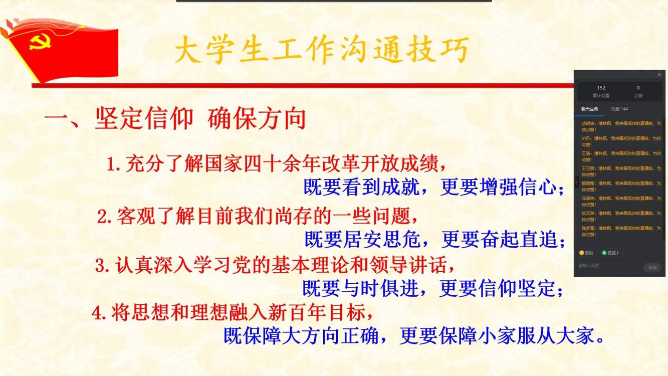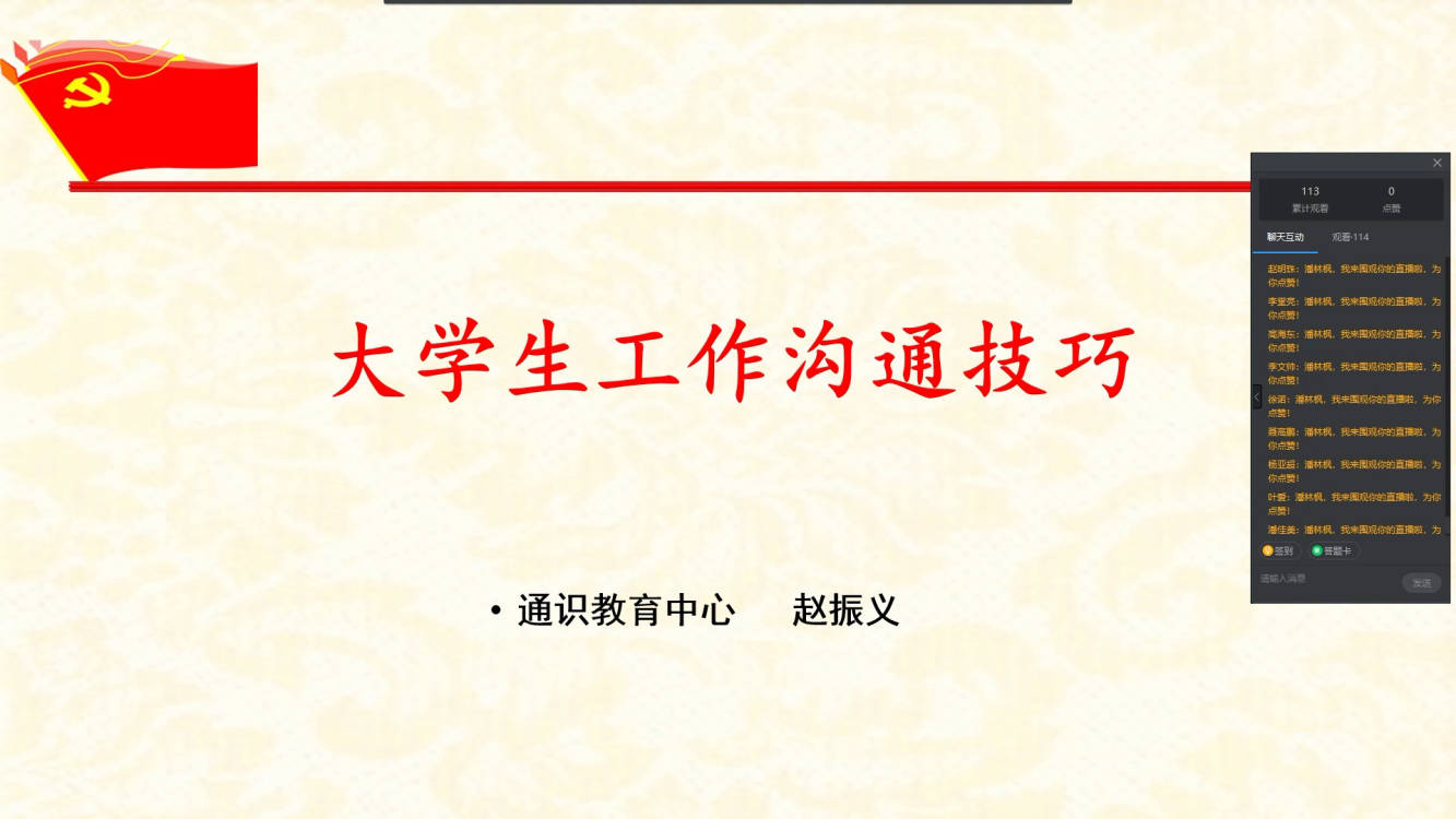 5月5日18:50,点点官网第十一期青马工程培训班第十二讲以线上钉钉直播的形式顺利举行。点点官网通识教育中心赵振义老师以《学生工作中人际关系与沟通技巧》为主题受邀担任主讲,第十一期青马工程培训班全体学员共400余人参与了此次培训。