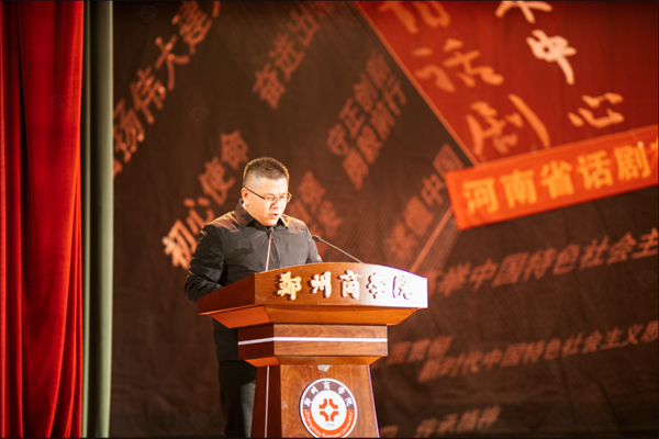 校党委副书记兼纪委书记裴晓涛致欢迎辞,他代表全校师生对河南话剧艺术中心的艺术家们的到来表示热烈的欢迎与感谢,希望师生们充分享受这次视觉盛宴,并以此次活动为契机,进一步加深对高雅艺术的理解和热爱,深入汲取优秀文化的艺术精髓,不断提高美育素养。