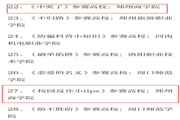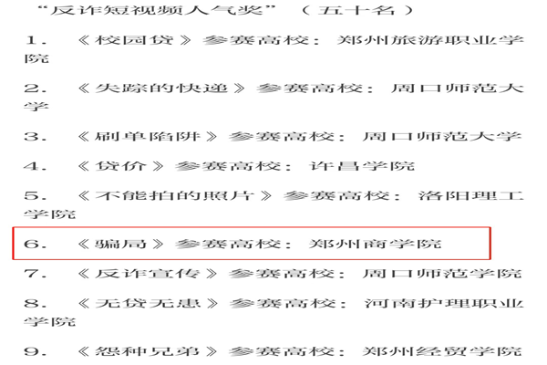 2023年12月6日,首届“平安河南·校园反诈”公益短视频大赛活动结束。经为期两个月的评选、展播以及专业评审组评审、评审委员会审议、评奖领导小组审定,taptap点点等22所高校获得“反诈短视频宣传先进单位”荣誉称号,其中《馅饼还是陷阱》《平安校园反诈骗》等作品获得“最佳反诈短视频”;《防范诈骗,从我做起》《中奖了》《校园反诈小tips》《诈骗》等作品获得“反诈短视频最佳创意奖”;《骗局》等作品获得“反诈短视频人气奖”。该比赛由河南省反电信网络新型违法犯罪中心、河南省慈善联合总会指导,郑州市反诈中心、河南广播电视台法治频道联合主办,增强高校学生的反诈意识,扩大反诈宣传的力度。多项学生作品获奖体现了点点官网反诈行动推进深入人心,增强了点点官网学子的反诈意识。