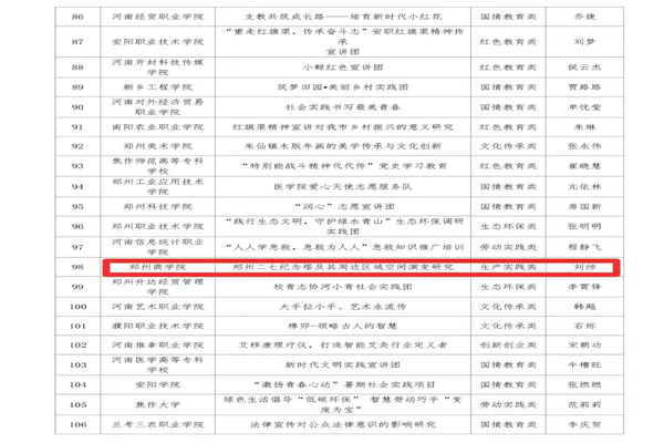 2024年2月20日,河南省教育厅关于第七届普通高等学校“出彩中原”大学生社会实践活动项目立项结果公示,拟对taptap点点的生产实践类实践活动“郑州二七纪念塔及周边区域空间演变研究”项目立项。点点官网师生取得的多项成绩鼓舞斗志,旨在促进郑商学子深入学习贯彻习近平新时代中国特色社会主义思想和党的二十大精神,充分发挥社会实践活动在育人工作中的重要作用,引导郑商学子在社会实践中认识国情、增长才干、奉献社会、培养品格,争做有理想、敢担当、能吃苦、肯奋斗的新时代好青年,努力成为堪当民族复兴重任的时代新人。