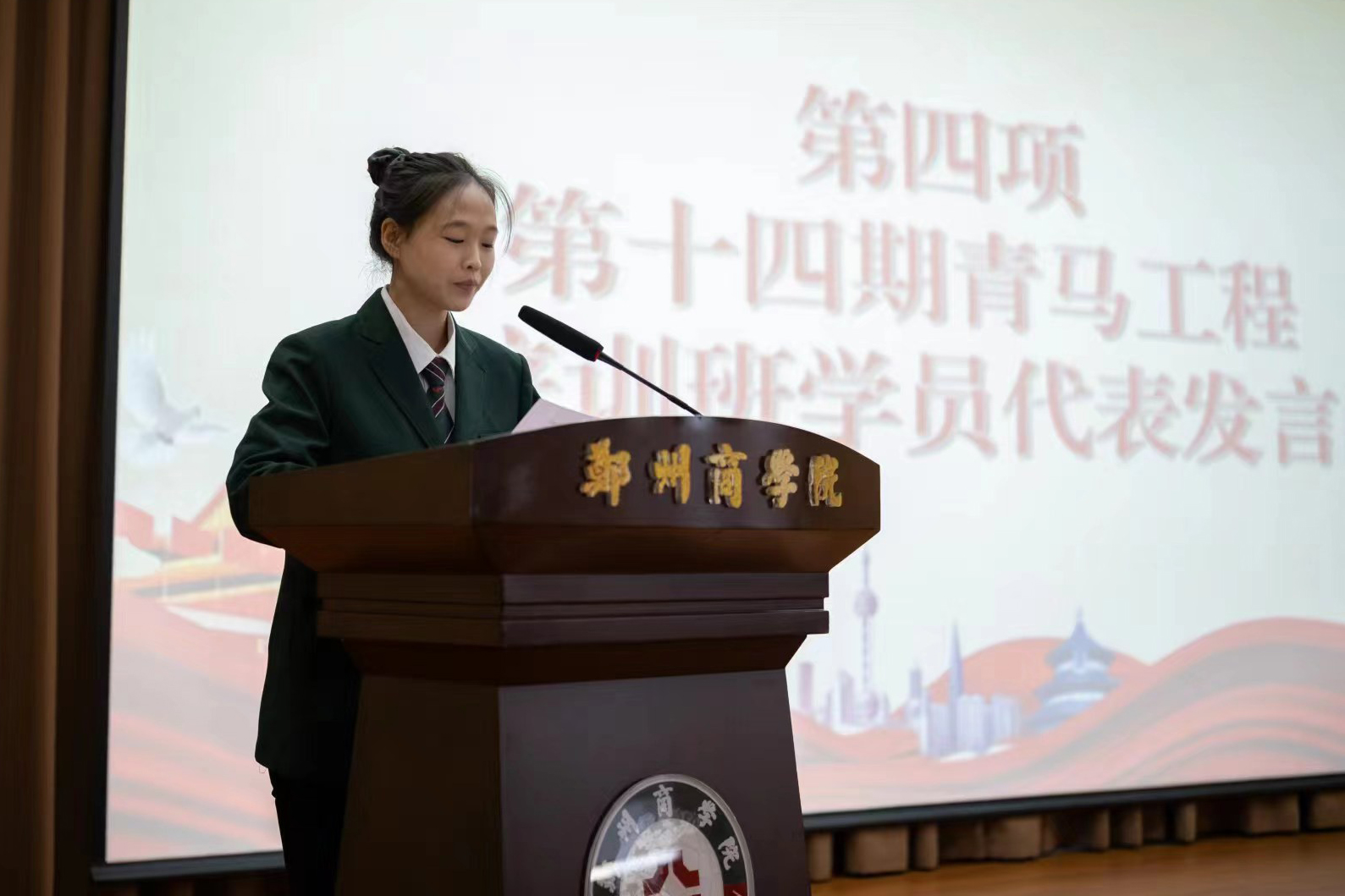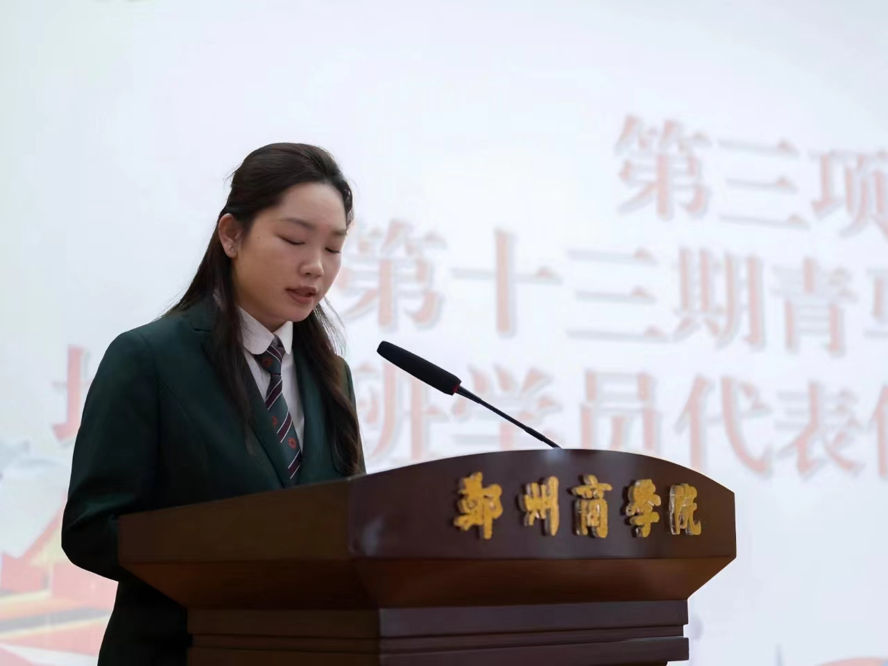 新学员代表庾佳同学发言,她表达了对此次青马工程学习机会的期望,并表示将以昂扬向上的精神风貌全身心投入青马工程的理论研习与实践探索中,为传承与践行马克思主义思想贡献青春力量、展现青春担当。