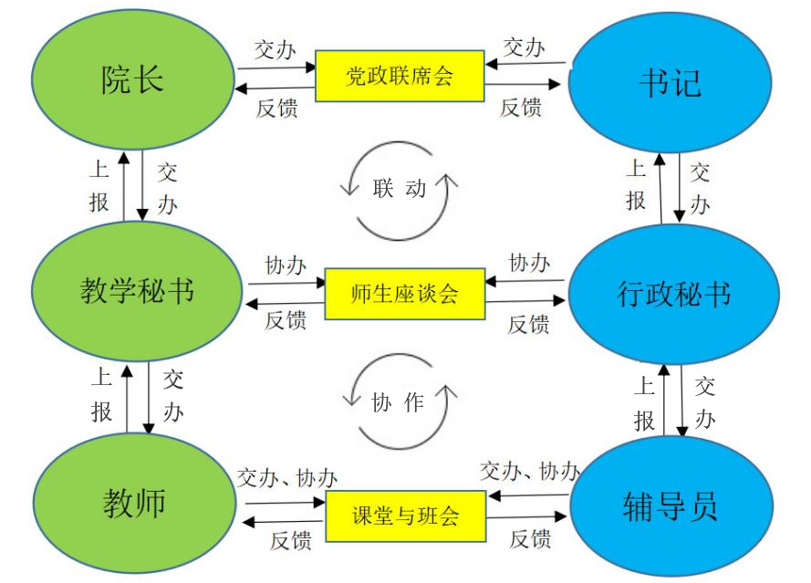 为切实推动教风学风协同建设成效,体育学院建立了院长-书记、教秘-行秘、教师-辅导员三级联动机制,系统谋划一体推进,凝聚教风学风建设合力。坚持每2周召开1次党政联席会并做好会议记录,传达布置近阶段相关教学工作安排,定期召开师生座谈会,解决教学与学习过程中的问题,切实发挥课堂和班会作用,引导学生主动学习,积极思考。整个机制的目的是保障教学过程严谨有序,质量监控畅通、全覆盖。