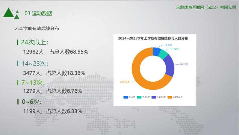 截至2024年12月13日统计,全校18924名学生自愿参与乐跑,完成有效跑步397397次,累计完成里程760615.64公里,人均里程40.19公里。
