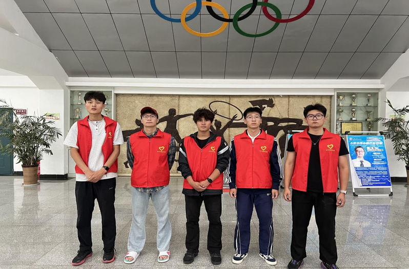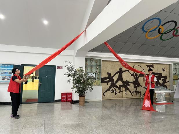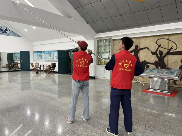 活动中,同学们身着志愿服装,手持清洁工具,高效且迅速地投入志愿劳动中。遇到难以清理的角落,志愿者们充分发挥创造力,创新出新的“劳动工具”,利用废旧横幅清理体馆大厅横梁上的羽毛球。