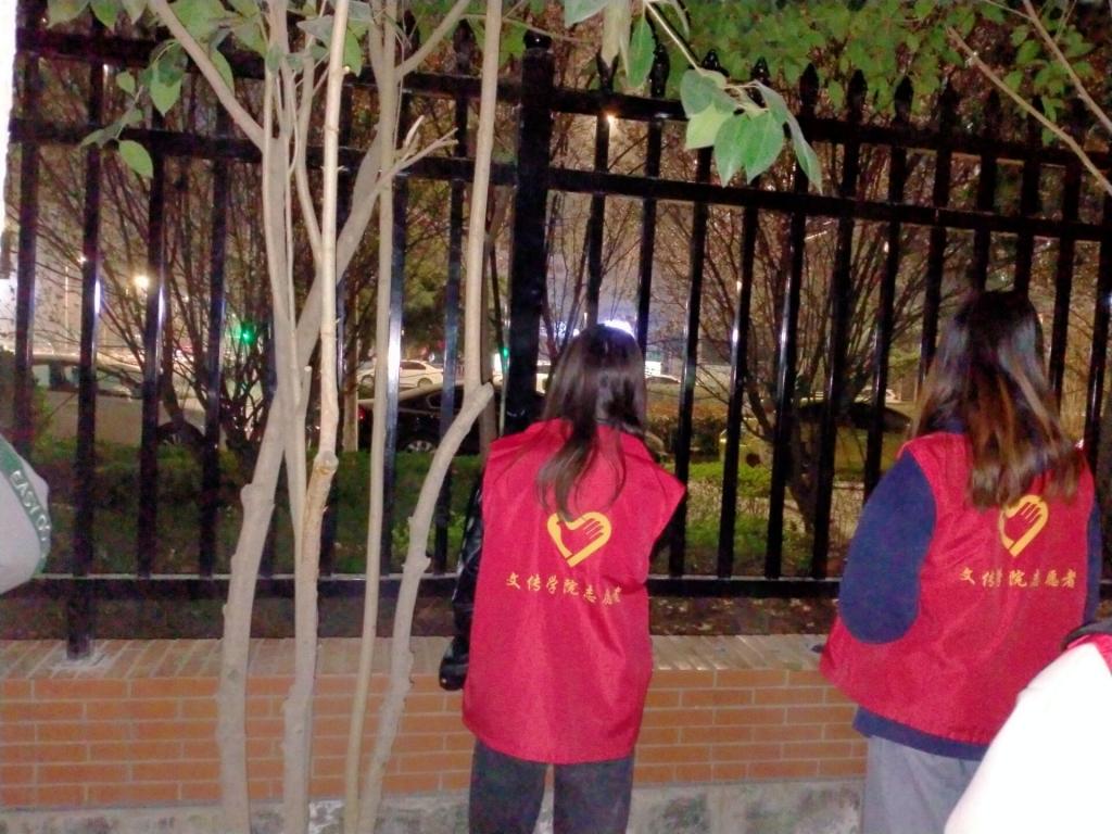 学生党员身着红马甲,认真巡查校园的各个角落,对校园内的基础设施进行检查,重点查看栅栏处翻墙现象,排查可能存在的校园安全隐患,并对于校内的不文明现象进行了劝诫和教育,引导学生服从大局,做好自我防护,自觉遵守疫情防控各项规定。