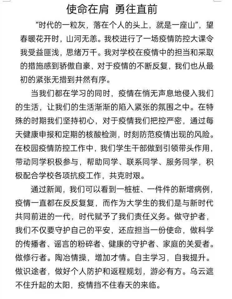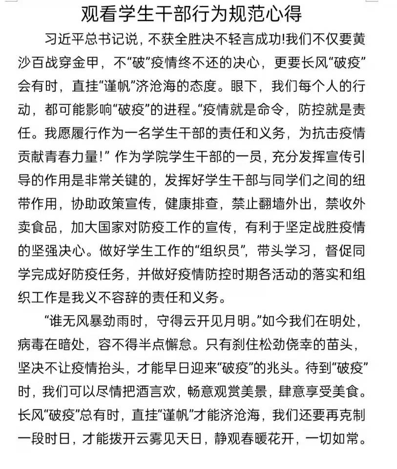 新一轮的疫情来势汹汹,呈现高度聚集性,疫情形势仍然严峻复杂。疫情当前,没有旁观者。抗击疫情,需要你我同行。3月19日,我院组织团委学生干部及班级学生干部自行观看学习《关于疫情防控期间学生干部行为规范》。以下是他们的学习心得,快来一起看看吧!