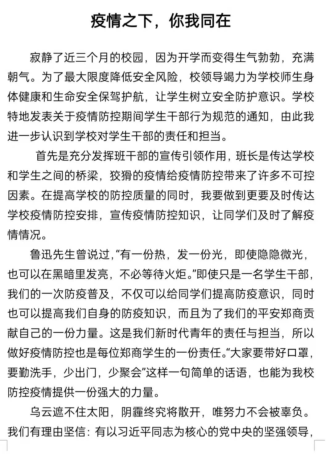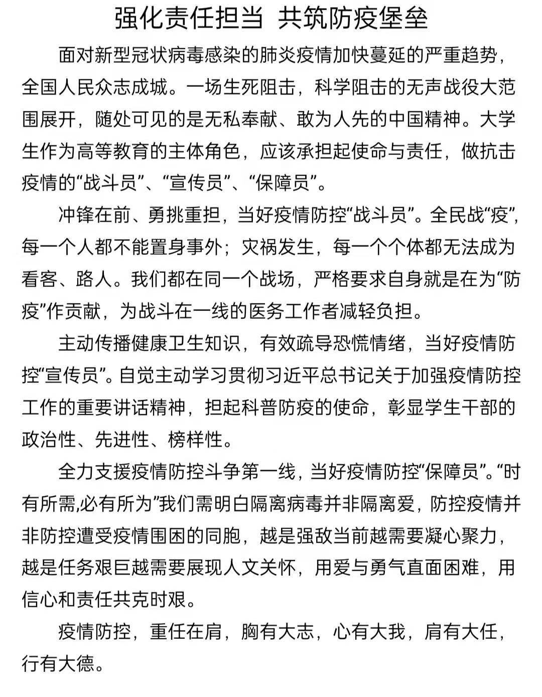 通过本次学习,提升了我院学生干部的责任担当,有利于协助学校做好疫情防控工作宣传和思想政治舆论引导。帮助同学们正确认识疫情,传播科学防控知识。坚定信心,众志成城,坚决打赢疫情防控攻坚战。