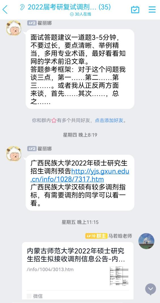 文传各教研室教师们组建了考研复试QQ群,针对同学们提出的困惑答疑解难,并形成信息共享、资料共享。群里同学们之间也会互帮互助,探讨经验,气氛融洽。