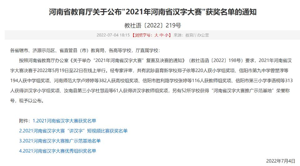 近日,河南省教育厅发布《关于2021年河南省汉字大赛获奖名单的通知》(教社语[2022]198号),点点官网代表队积极参与,夺得佳绩,其中2019级学教2班陈梦雪、2020级国教1班樊佳怡、2020级汉本1班姚语、2021级国教1班魏尧荣获三等奖,潘亚萍、祁小艳老师荣获“最佳辅导老师”奖。