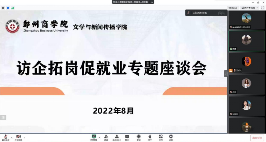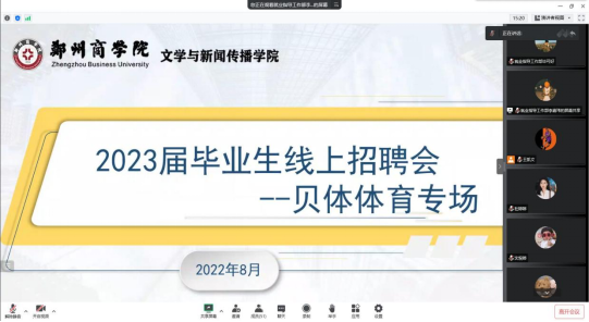 为深入贯彻党中央、国务院关于高校毕业生就业工作的决策部署,落实学校访企拓岗,深化校企合作,搭建校企合作平台,全力促进高校毕业生高质量就业。8月16日下午,我院与贝体体育共同召开线上访企拓岗促进就业专题座谈会。会议由就业专员王凯文老师主持进行,文传学院党委书记贾蓓、团委书记王凯、2023届毕业班辅导员及全体2023届毕业生参会。