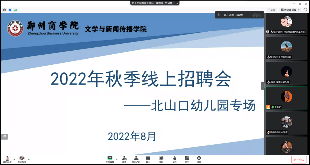 为推动我院毕业生多维度、高质量就业,进一步开拓更多的实习实训和优质就业岗位,同时深化校企合作机会,8月18日下午,我院举行2022年秋季线上招聘会第二场。本次会议由我院就业专员王凯文老师主持,北山口镇实验幼儿园曹老师,2023届毕业班辅导员及部分2023届学前教育专业毕业生参会。