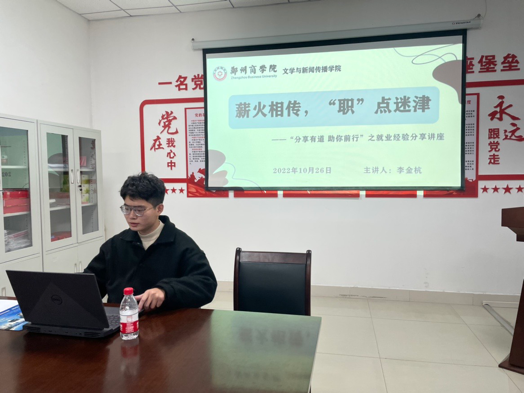 2022年10月26日晚,我院顺利举行“分享有道 助你前行”系列讲座——就业经验分享讲座。本次讲座的主题为 “薪火相传,‘职’点迷津”,主讲人是我院 2019 级李金杭同学,其曾任文传学院第十五届团委副书记。本次活动以就业经验分享为主要内容,李金杭将自己实习工作经历与就业选择方面相结合,为大家进行了全面的讲解。