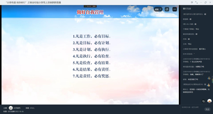 首先,李金杭同学从目标职业和选择因素出发,对各类职业进行讲解,让大家认识到职业选择与家庭距离、薪资收入、工作环境、晋升空间等各因素息息相关。然后,又从学习和生活两个方面向大家提出建议。呼吁同学们以提升能力为目标,提升自身气质,掌握与人沟通的技巧并做好自我管理,调节自我情绪。最后,李金杭同学针对同学们提出的问题进行耐心解答,给予了同学们诸多可借鉴性的指导。