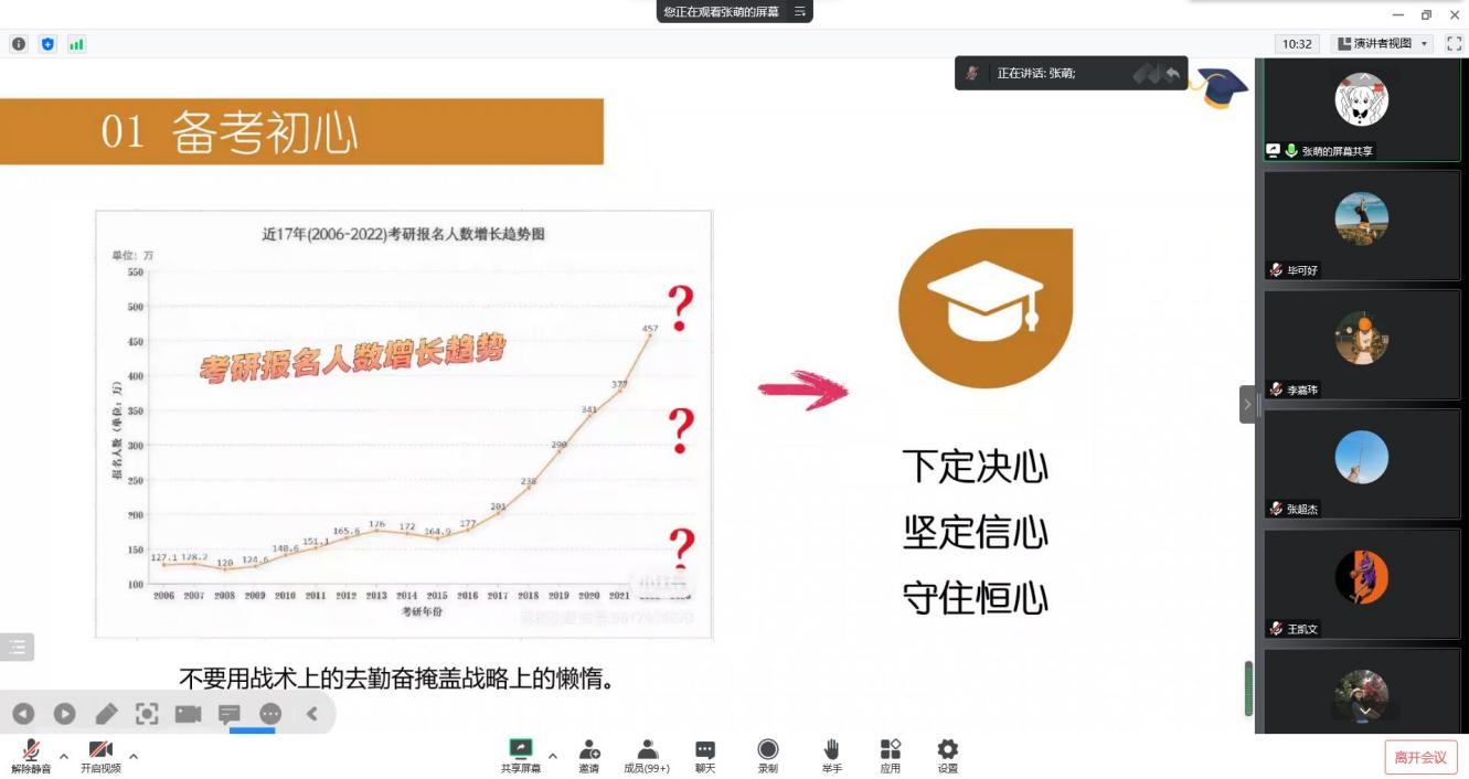 本次交流会邀请到我院2021届学前教育专业优秀毕业生张萌同学作为主讲人。张萌学姐以学前教育考研经验为主讲内容并结合自身的备考历程向我们介绍了“考研不能入的坑”,为同学们分享了考研过程中常用到的网站、课程、学习资料。最后,张萌学姐与同学们进行了互动交流,针对同学们的疑问提供了许多有效指导与建议。