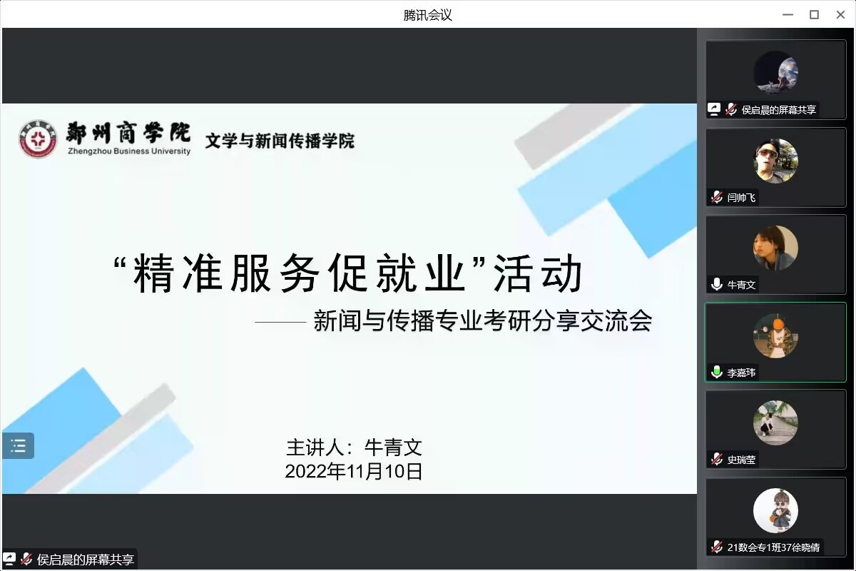 长空万里砺鹏翅,瀚海千帆竞远舟。2023届的考研人不惧风寒,仍在争分夺秒地备考,为使同学们对考研有更清楚的认识、更明确的目标以及在备考中能有一个清晰的规划。11月10日18时我院开展“精准服务促就业”系列活动——新闻与传播专业考研分享交流会。本次交流会邀请到我院2021届新闻学专业毕业生、现天津师范大学新闻传播专业研究生牛青文同学作为主讲人为同学们分享考研心得及经验。