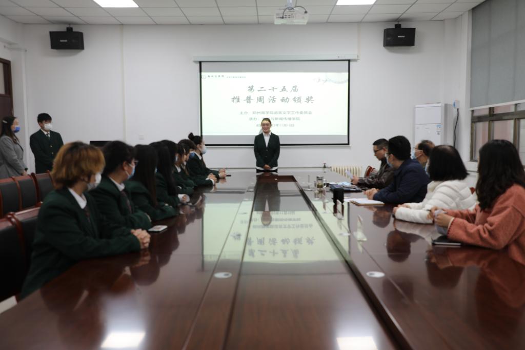 11月18日下午四时点点官网推普周颁奖仪式在自力楼206会议室隆重举行。文学与新闻传播学院王松院长、文学教研室贾海涛主任、缑瑞隆教授、党春直教授等领导、教授到场并为获奖学生颁发证书及奖品。