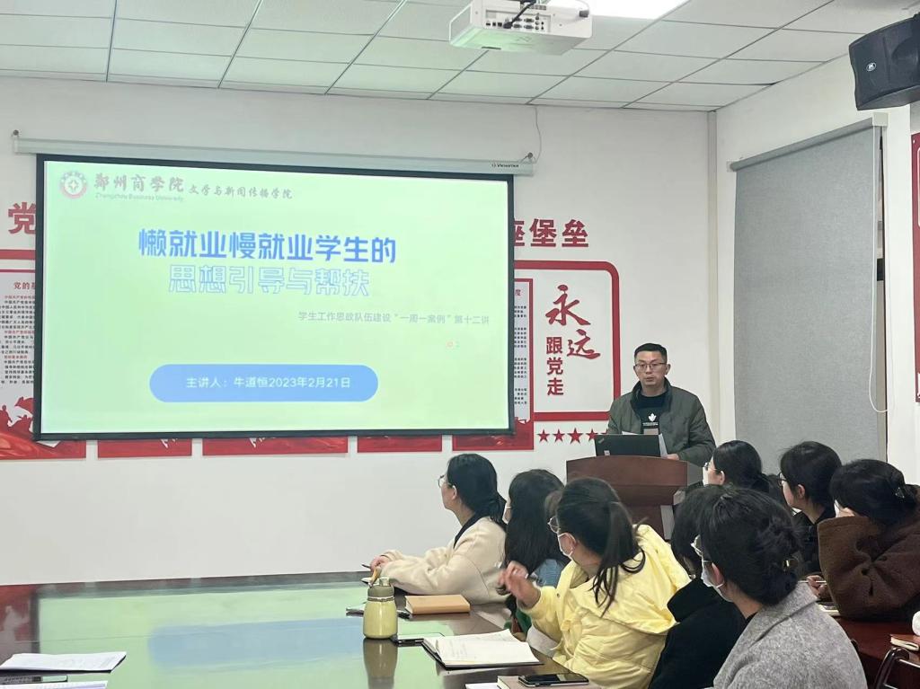 2月21日下午,我院开展辅导员队伍建设“一周一案例”的第十二讲,本期由辅导员牛道恒老师主讲,他分享的主题是:懒就业慢就业学生的思想引导和帮扶。
