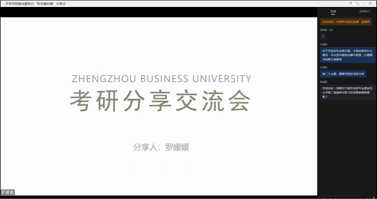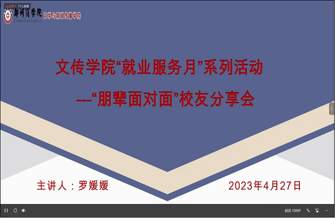 为深入学习贯彻落实党的二十大精神,促进毕业生高质量就业,为学生实现“能就业、好就业、就好业、能创业”的目标,帮助学生做好大学期间的学业规划与指导。4月27日晚上,我院组织开展“就业服务月”系列活动之“朋辈面对面”校友分享会。此次会议邀请了文传学院2022届广告学专业优秀毕业生,今年顺利考取西安外国语大学研究生的罗媛媛作为主讲人进行分享,参会人员由我院20级、21级和22级广告学专业的学生组成。此次分享会在线上进行,由我院辅导员牛道恒老师主持。