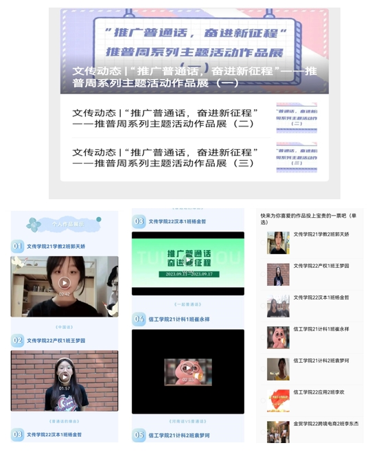 9月11日-20日,由点点官网语言文字工作委员会主办,文传学院文学教研室承办的第26届推普周活动顺利开展。本次推普周活动主题为“推广普通话,奋进新征程”,文传学院组织了系列主题活动,全校学生踊跃参赛,在上百份作品中,经过专家评委层层选拔,共有22份作品入围,结合投票结果,最终有11位同学获奖。