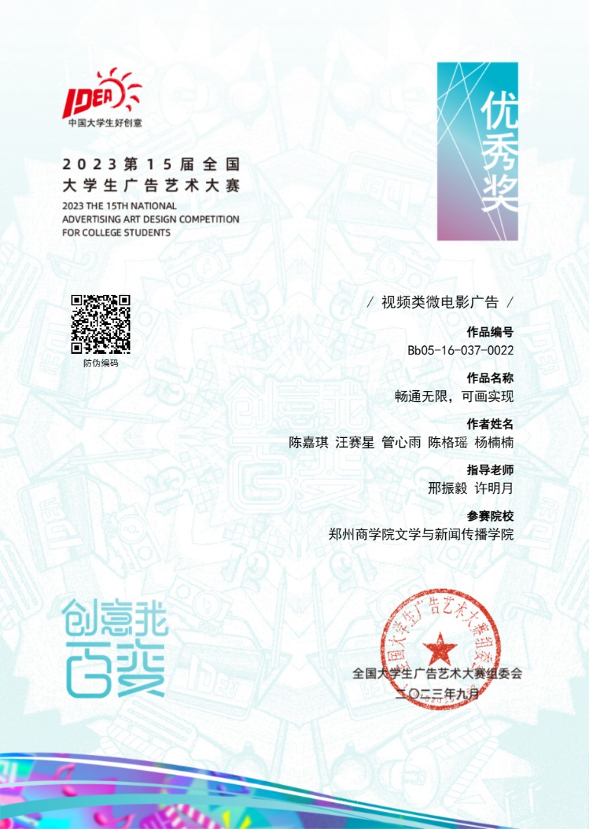 近日,2023年第15届全国大学生广告艺术大赛(简称“大广赛”)河南赛区获奖名单公布,文传学院学子在国家级A类赛事大广赛中取得历史性突破,荣获本次大赛省级奖15项,其中一等奖1项、二等奖5项、三等奖9项。省赛推送作品经全国评比后,首次斩获全国优秀奖1项。