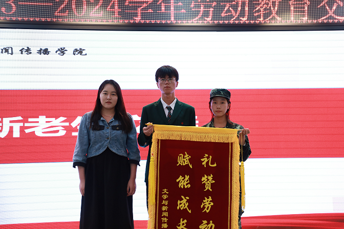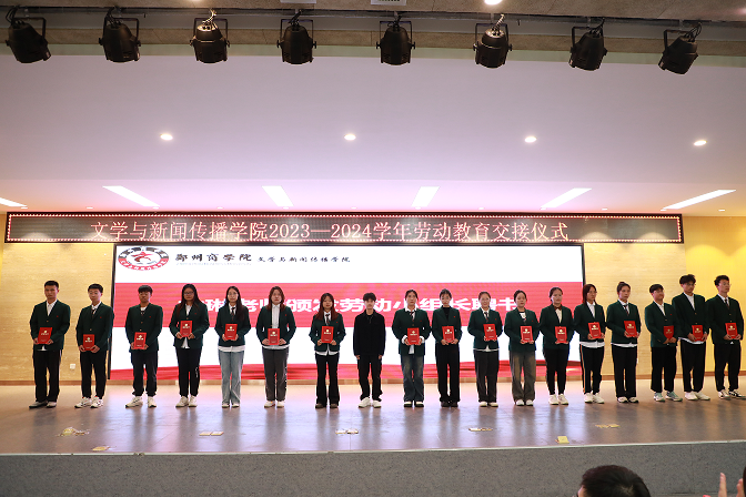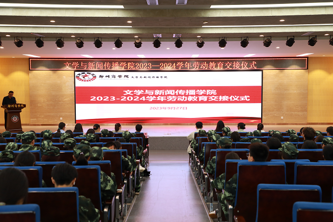 仪式在庄严的国歌声中拉开序幕。首先由我院团委书记王凯宣读《关于2023级劳动小组长的任命决定》,并由林琳老师为他们颁发聘书并合影留念。随后由2022级劳动小组长郑晓龙和2023级新生劳动委员代表黄明雨发言;接着进行新老生劳动教育锦旗--礼赞劳动 赋能成长的交接仪式,锦旗的交接不只是物质的传授,更是劳动育人精神的传承。最后,贾蓓书记作总结讲话。她从点点官网创办人王广亚博士的“养成教育”思想说起,教育引导新生热爱劳动,认识劳动创造人、劳动创造价值、劳动创造财富、劳动创造美好生活的道理,同时要尊重劳动,尊重普通劳动者,牢固树立劳动最光荣、劳动最崇高、劳动最伟大、劳动最美丽的思想观念,培育积极的劳动精神,养成良好的劳动习惯和品质,以劳立德,以劳增智,做出彩的文传人,成功的郑商人!