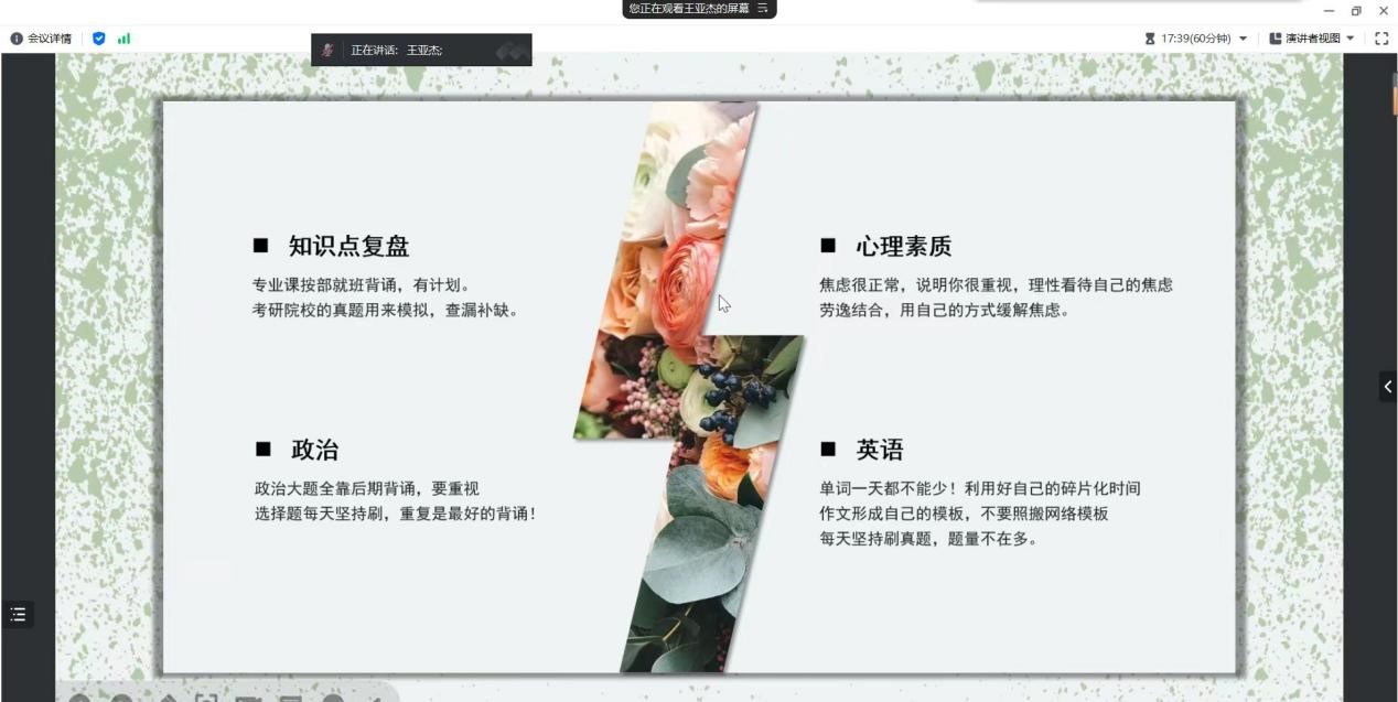 在考研百日冲刺之时,这场指导会成功举办,不仅为同学们提供了宝贵的备考经验,还为同学们提供了相互学习、相互鼓励的平台。同学们不仅学到了备考的方法和技巧,更重要的是汲取经验教训,为自己在接下来的考研备考中少走弯路、提高效率提供了有益的帮助。