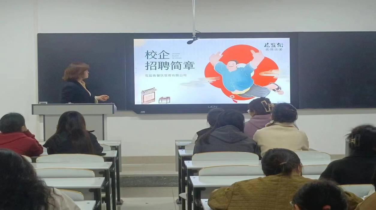 花盐街餐饮管理有限公司负责人从“公司简介”、“公司环境”、“员工福利”、“招聘岗位及发展”等方面进行全方面的介绍,帮助同学们更好的了解企业工作。最后对同学们提出的疑问进行详细解答,并向我院学子抛出橄榄枝。