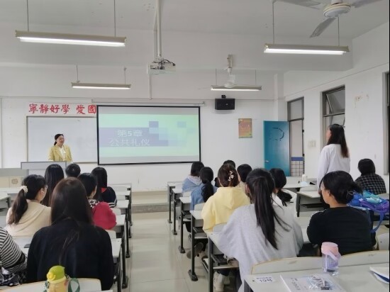 本周教学亮点是文学教研室专职教师徐腾云老师,本堂课以突出教学重点——"公共礼仪"为核心。在课堂上,徐老师巧妙运用形象的肢体语言,生动地呈现教学内容,成功地完成了教学任务。徐老师备课充分,教学环节紧凑,教学语言洪亮清晰,教态清新优美自然,师生之间的互动紧密围绕着难点与重点展开。