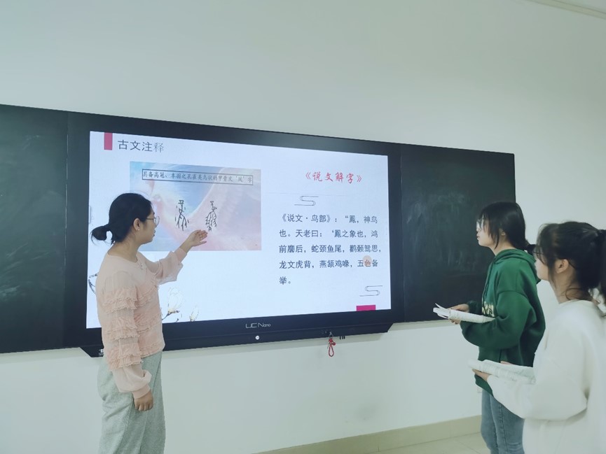 10月16日第5节在Y509教室,文传学院专职教师杜微微,为21级汉本5班讲授《文字学》课程。杜老师在介绍“商代文字”时突出介绍了“甲骨文”的发现过程、形成原因、历史价值等,围绕甲骨文“卜辞”这一教学难点,完整地介绍了甲骨文是在“整龟-灼龟-观兆一刻辞”的过程中形成的,辅助于PPT图片使学生很好地理解了商文明的伟大成果,使学生认识到黄河文明的奇迹,增加了民族文化的自信心。